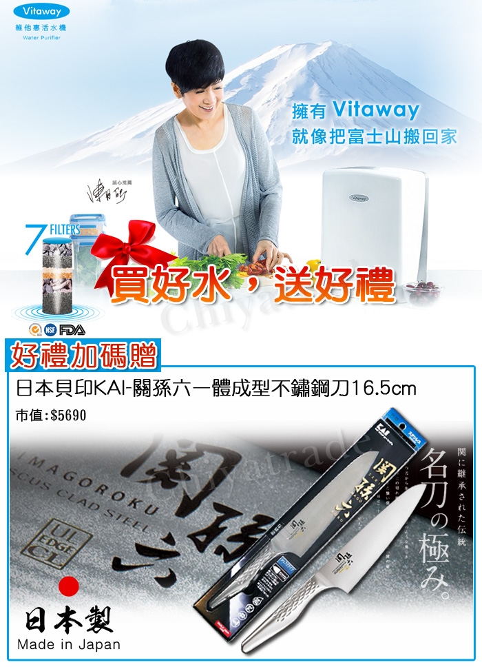 有了Vitaway,不僅讓您在家就能享受到大自然精華的活水,更實現全食物健康飲食的重要環節。還原礦泉地質層層的濾水過程,完整保留人體需要的天然礦物質,呈現天然微鹼性的自然活水,滴滴純淨,口口回甘。這樣自然、簡單又環保省錢的方式,正是我追求的,也誠心推薦給您。只要擁有Vitaway維他惠活水機,在家中就能隨時飲用媲美富士山礦泉水的甘甜好水!」