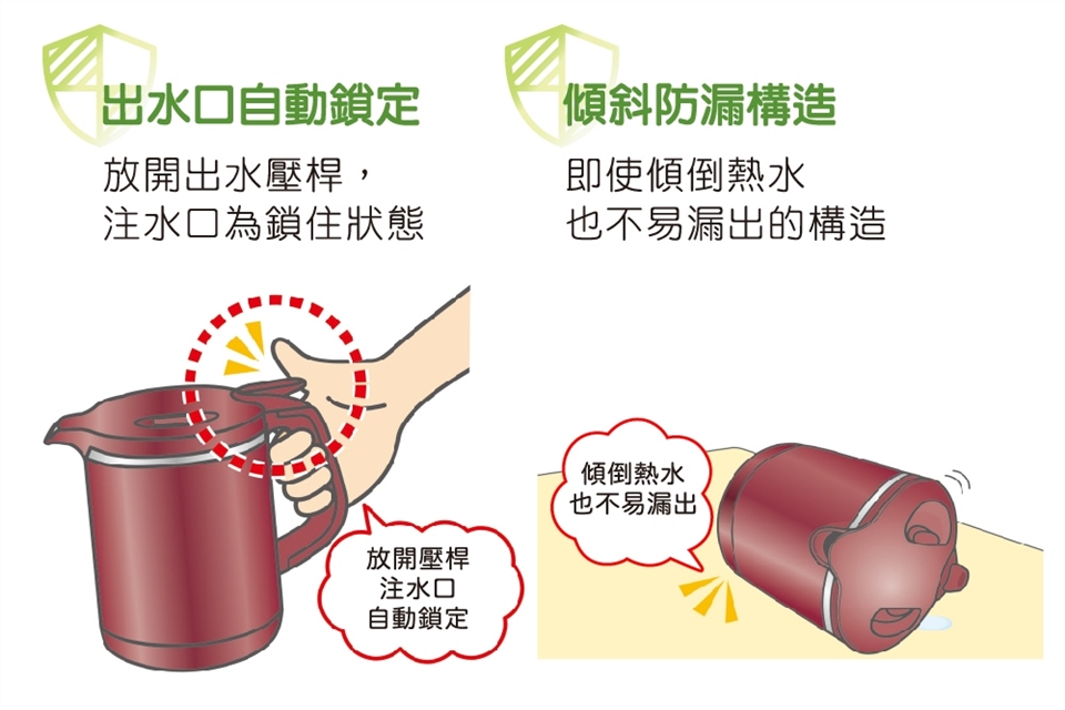 ‧傾倒不易漏水:即使傾倒熱水也不易漏出的構造。