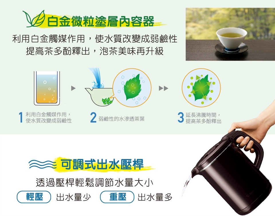 (3)「白金微粒塗層內容器」,使水質改變成弱鹼性,有效提高茶葉中茶多酚釋出。