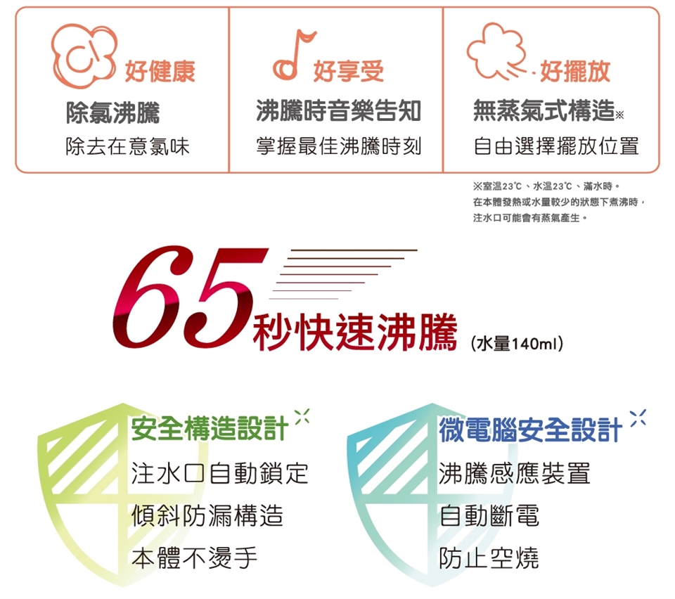 (2) 所需水量即刻沸騰,一杯水量(140ml)只需約65秒快速煮沸(室溫23℃、水溫23℃)。