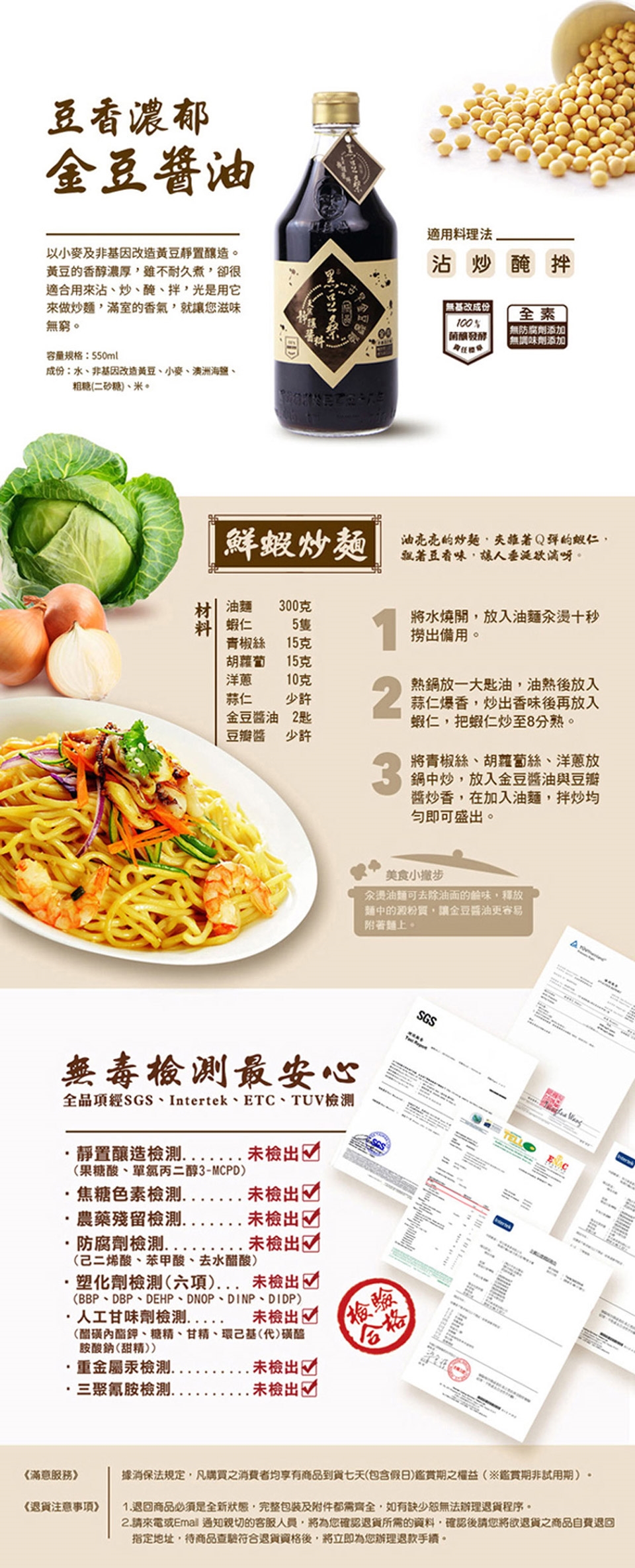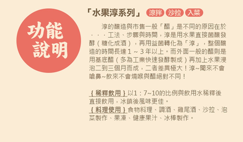 商品詳細介紹 使用方法說明 ‧醬油、醬料類 保存期限:2年 (開瓶需冷藏,因無防腐劑添加)‧淳 類 保存期限:3年(開瓶需冷藏,因無防腐劑添加) 注意事項 ‧銷售注意事項:無開放試吃 ‧退貨限制:開封後除本身商品瑕疵外恕不接受退貨