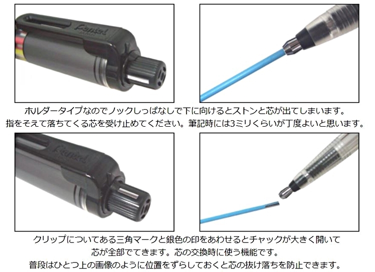 ● 有預防筆芯掉出的設計,要換掉整支筆芯時須將筆蓋上的標示對準筆夾上的箭頭才可以換芯