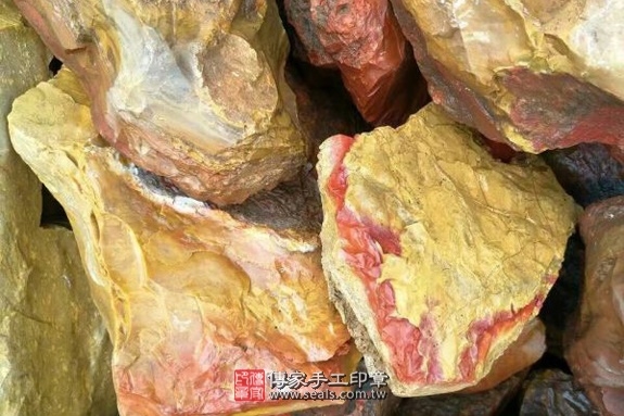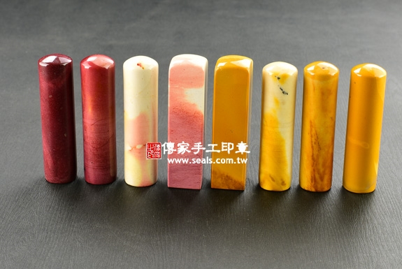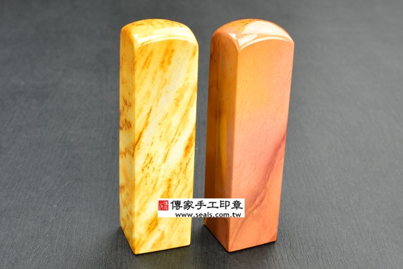 1. 傳家手工印章嚴選高級「蛋黃石」。蛋黃石的硬度很硬,大約是6度~7度,比重2.60 ~2.64,色彩相當有層次感。是頂級的印材之一。