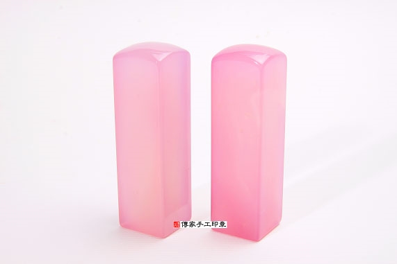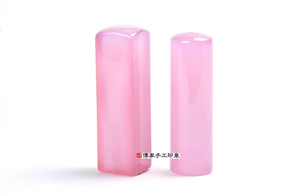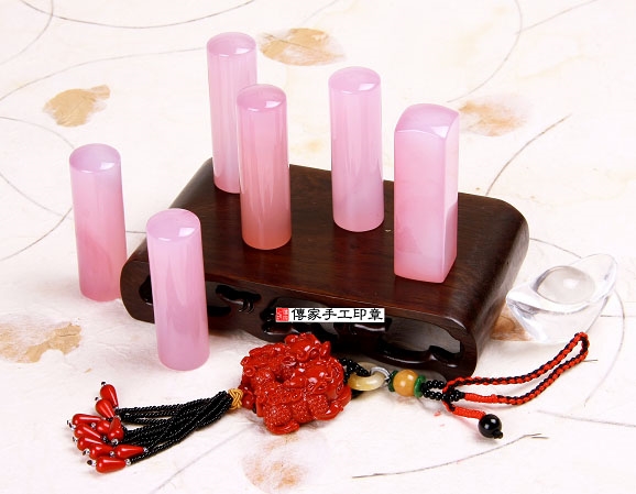 1. 傳家手工印章嚴選高級「粉紅瑪瑙」。瑪瑙的硬度很硬,大約是7度~7.5度,比重2.65,色彩相當有層次感。是頂級的印材之一。
