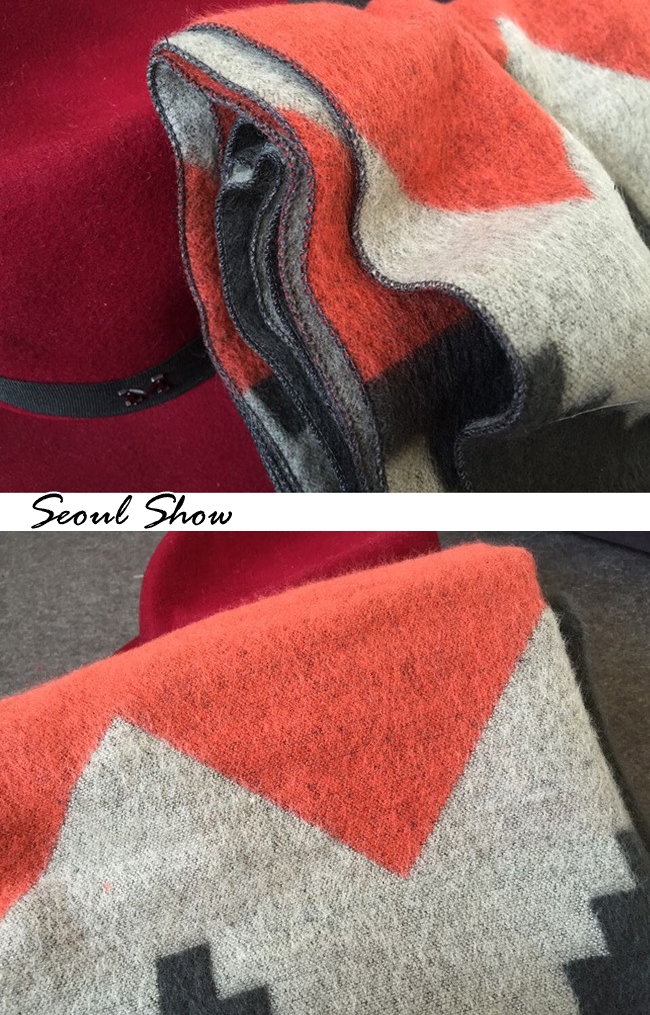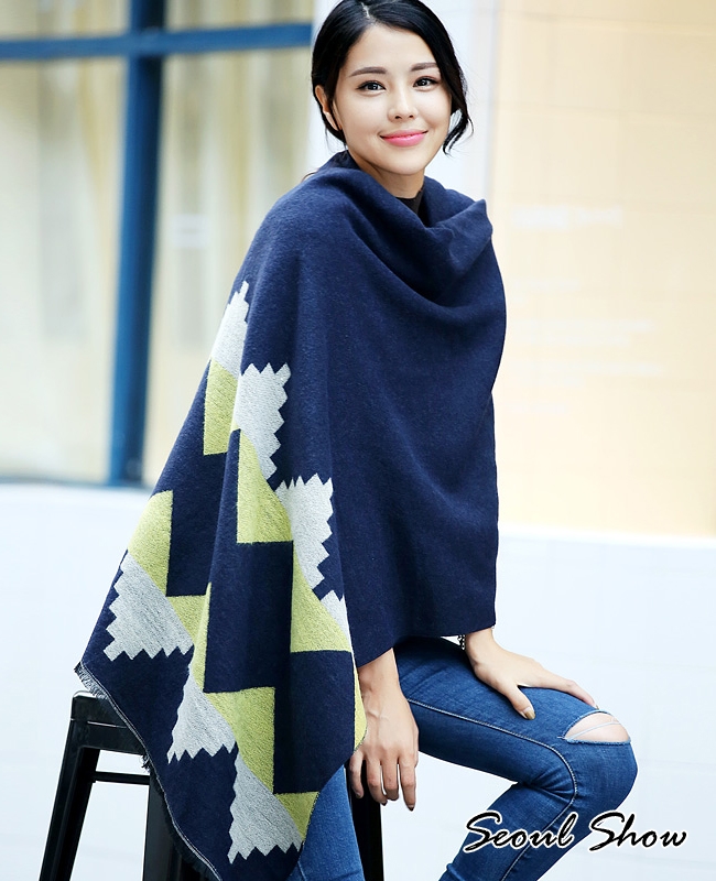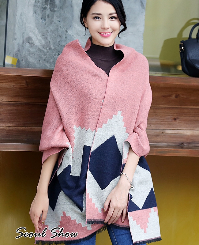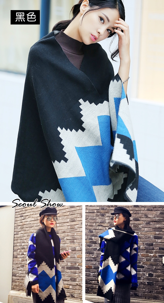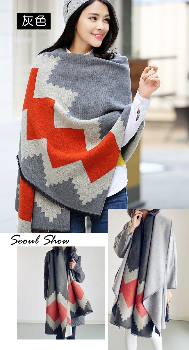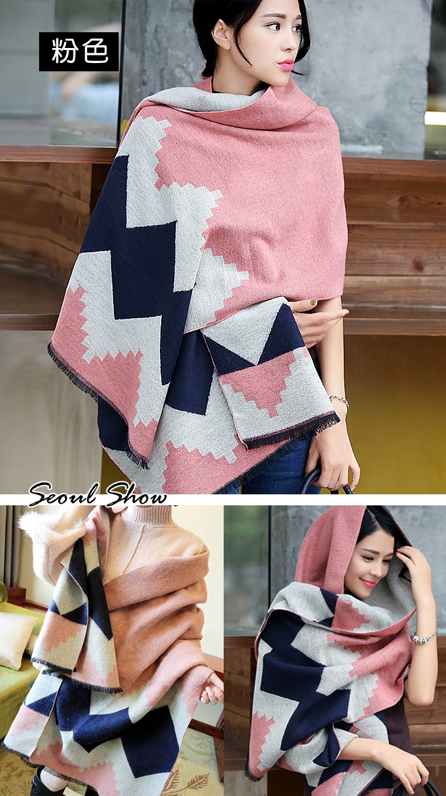 seoul show首爾秀 韓版雙面撞色菱形仿羊絨圍巾披肩