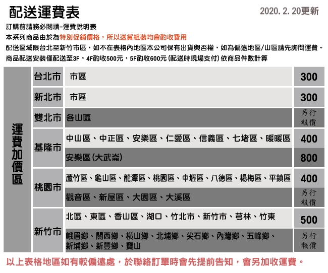 5.大型傢俱類、實因特殊地型限制偏遠山區、鄉鎮無法送貨時,本公司保有出貨與否權利