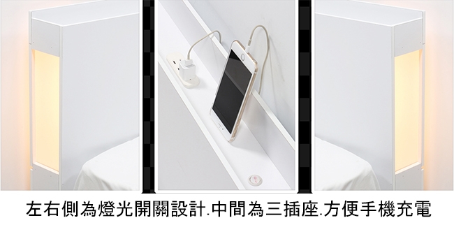 ◆ 日式簡約雙側崁燈造型床頭片,加厚型設計,上層附插電座,同時具置物功能