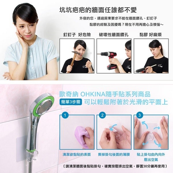 ◆產品貼合後,請先用手試拉掛勾是否完全附著,若馬上脫落因是該牆面凹凸不平或髒汙。