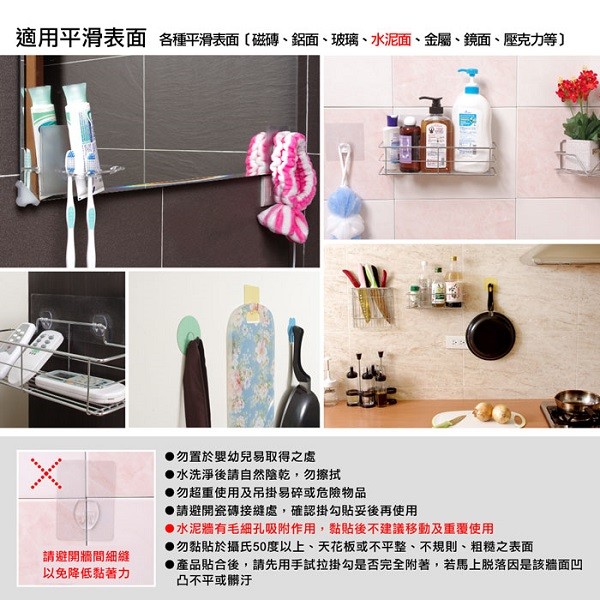 ◆掛勾可重覆黏貼,例:各種平滑表面,磁磚、鋁面、玻璃、水泥面、金屬、鏡面、壓克力等。