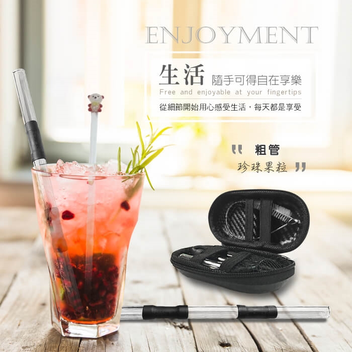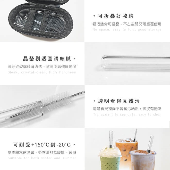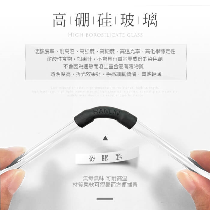 1.超好收納好折疊 2.原創獨家開模HANLIN專利設計 3.結合 高硼硅玻璃+無毒矽膠套管(符合SGS認證符合FDA) 4.清洗容易, 一通到底, 管內無阻礙物(他牌設計的內有TPE影響吸管順暢度) 5.易拆解好組裝,(他牌設計結構易散落難組裝) 6.清潔看的見 7.長短自己組合搭配