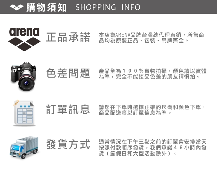 本店為ARENA品牌台灣總代理直銷,所售商品均為原裝正品,包裝、吊牌齊全。