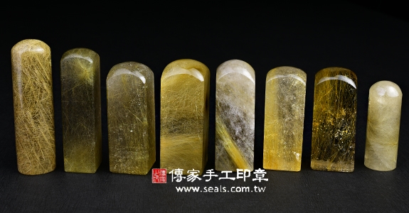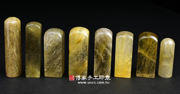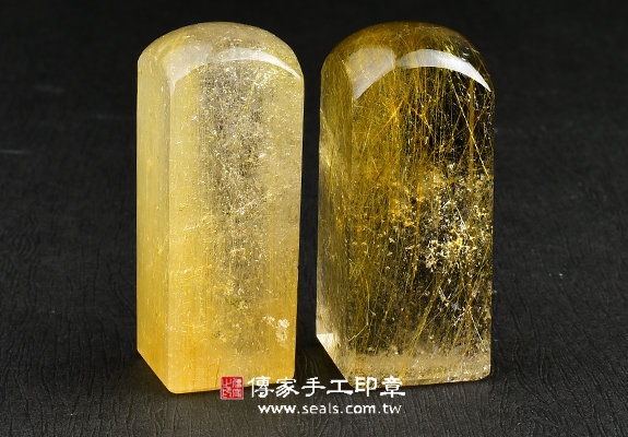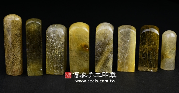 1. 傳家手工印章嚴選高級「頂級天然金黃髮晶個人印章」。金黃髮晶印章的硬度很高,大約是7度,是常見的頂級的印材之一。