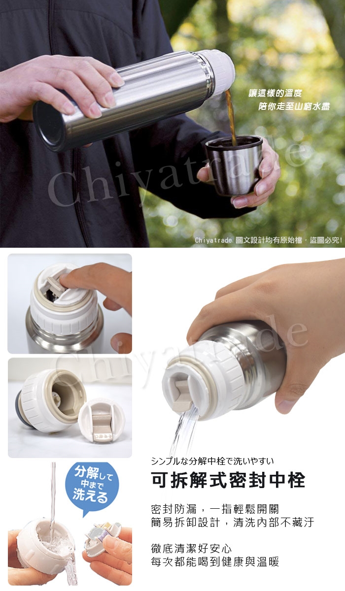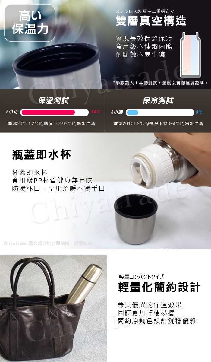 攜帶輕盈,雙層真空隔熱實現長效保溫,食用級不鏽鋼內膽,耐腐蝕不易生鏽。