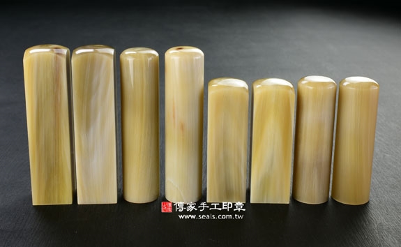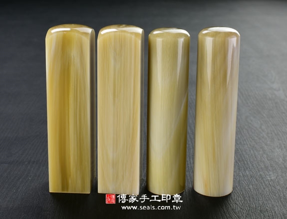 1. 傳家手工印章嚴選南非地區的高級「赤牛角」。赤牛角材質溫潤、堅硬,每個赤牛角印章都看得到牛角心,有獨特和天然的牛角紋路,以及半透明的絲透質感。