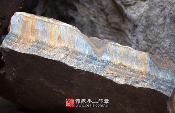1. 傳家手工印章嚴選高級「藍虎眼石」,虎眼石的色彩非常的豐富,像黃、金黃、棕黃、棕、黃褐、褐、紅、藍等色都有,甚至在同一塊虎眼石上會出現兩種、三種或更多種顏色,按照顏色可以將虎眼石分為黃虎眼石、紅虎眼石以及藍虎眼石等,其中以黃虎眼石的產量最多,而藍虎眼石是虎眼石在誕生的過程中硅化未完成的藍色變異種,在產量上更為珍貴。