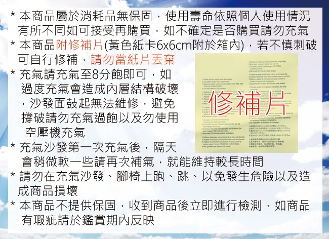 1.充氣沙發屬消耗品,使用壽命依個人使用有所不同