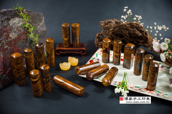 1. 傳家手工印章嚴選高級「鐵虎石」,因其紋理和顏色像木紋,所以又稱為木變石。是一種石英集合體,不定形礦物。通常有褐黃色,藍色,紅褐色等顏色,不透明,質地細膩堅韌,具有微細纖維狀結構,而每顆鐵虎石都有屬於自己的天然紋路和色澤。使用鐵虎石當做開運印章,是最高等級的印材之一。