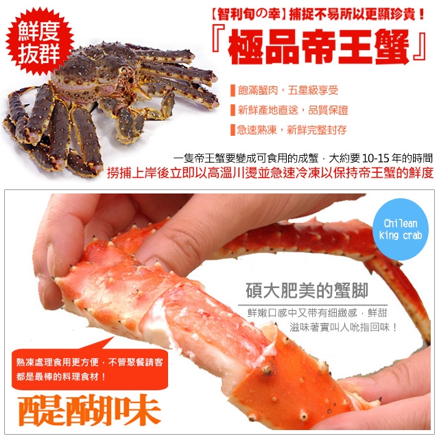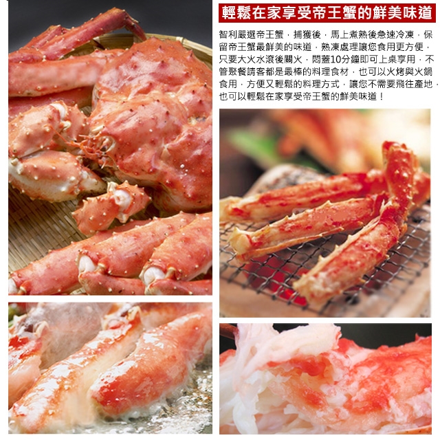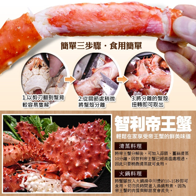 1. 帝王蟹清蒸料理:將帝王蟹分解後,可加入蒜頭、薑絲清蒸10分鐘,因智利帝王蟹以經高溫處理過,因此只要稍微清蒸就可食用。