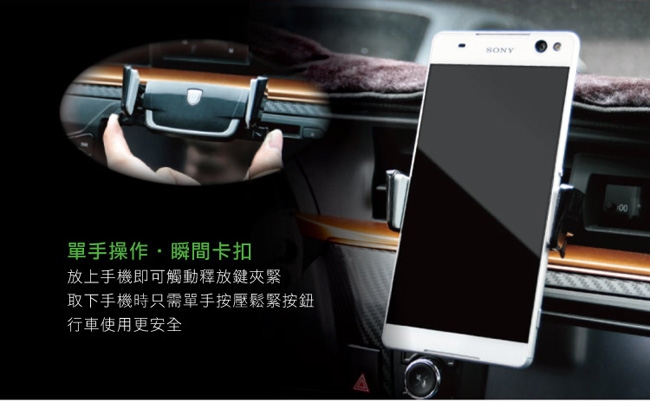 ■瞬間卡扣,單手即可操作,放上手機即可觸動釋放鍵夾緊。
