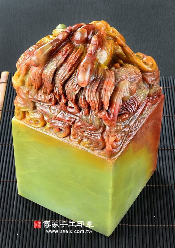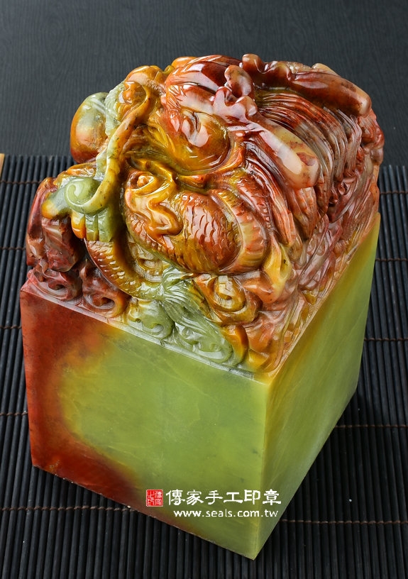 一.品名:頂級壽山石精雕神龍吐珠(十七)廟章。(三吋四印章、高度約20公分)