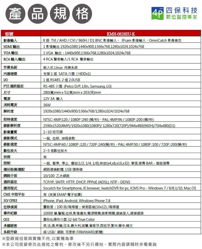 .支援IPC、AHD、TVI、CVI、960H/D1 各式攝影機訊號,攝影機影像可隨意更換。