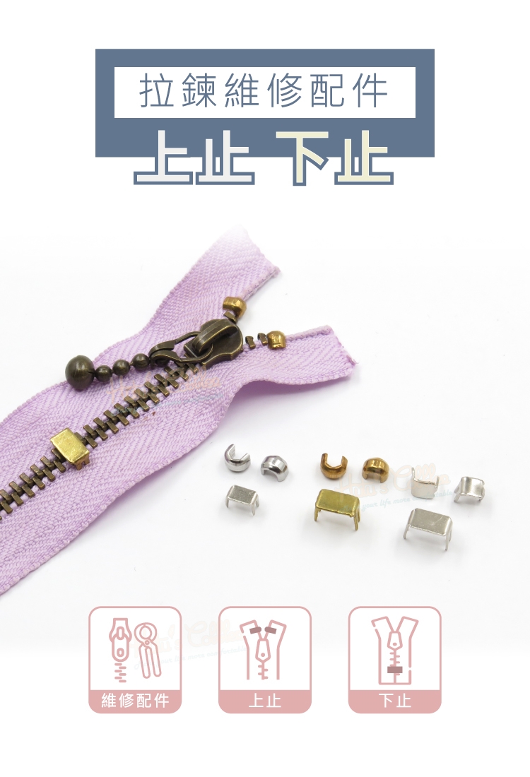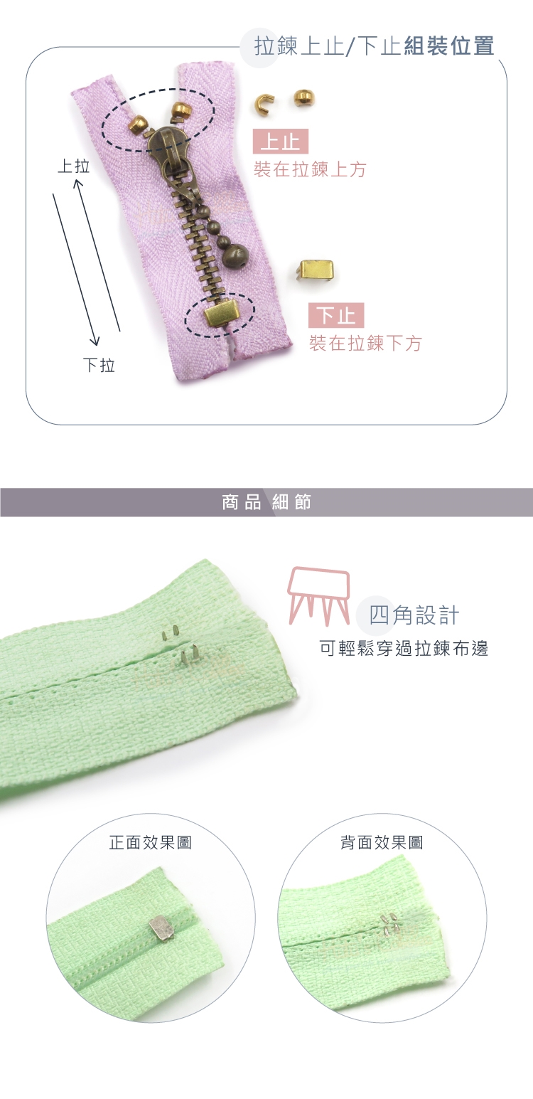 安裝下止:四角碼 四角爪碼 後止片 後檔片,將鍊齒尾端封死,防止拉鍊拉出滑落