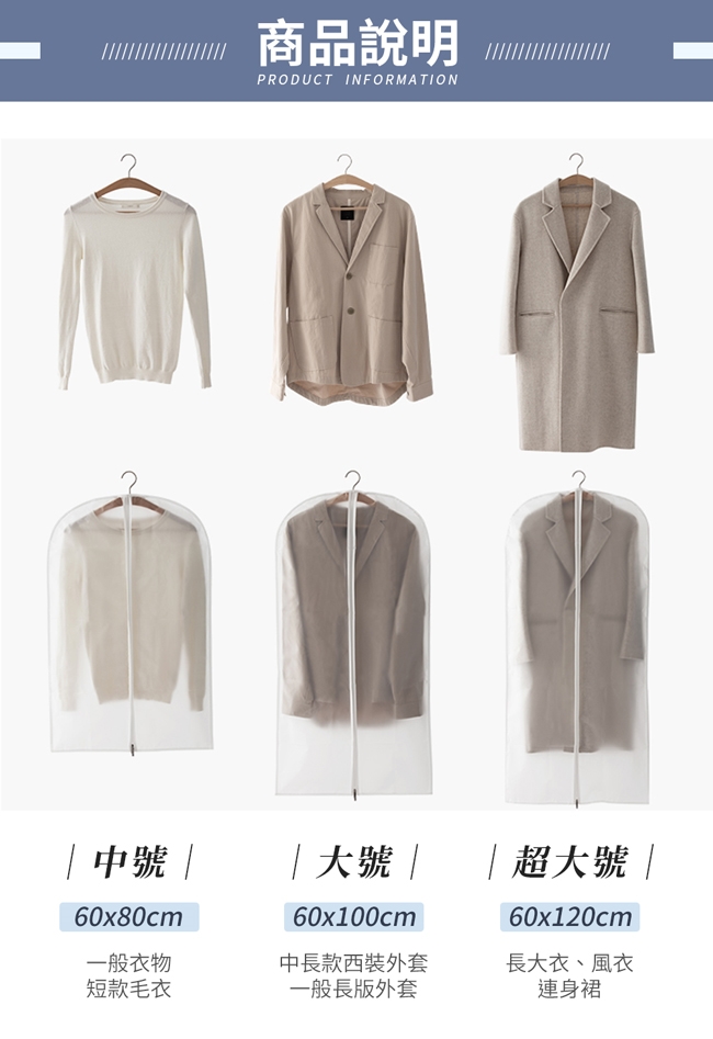 ◆ 商品名稱:半透明衣物防塵收納袋60x100cm(大號/5入)
