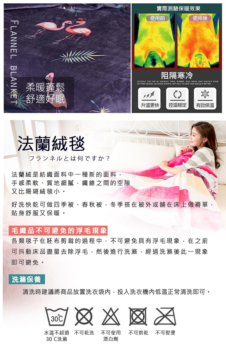 不用擔心耐洗不褪色、不起毛球、防靜電,是您在寒冷的冬季必備寢具。