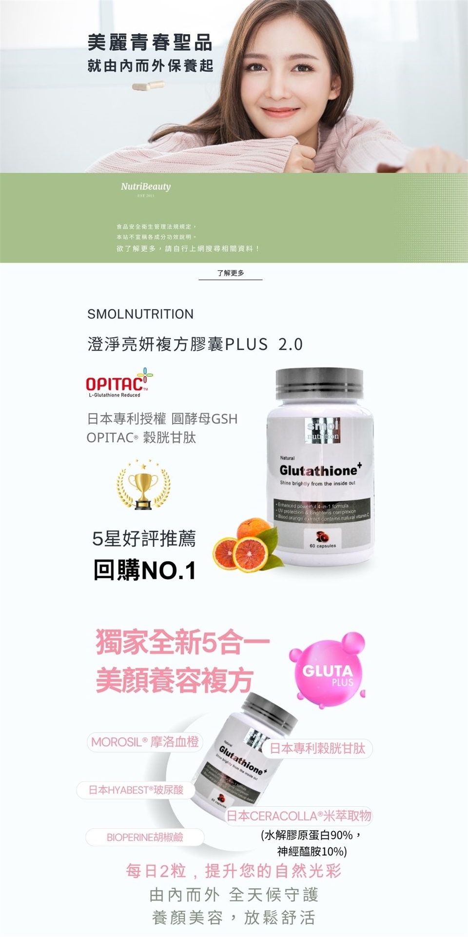 相較於單一配方,SMOL 澄淨亮妍複方 PLUS 2.0 採用多重專利複方設計,科學搭配穀胱甘肽,讓養妍管理更全面,效果更有感!✨