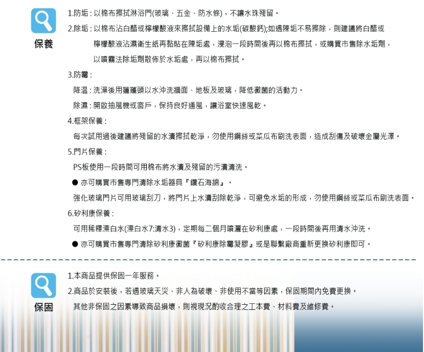 1.防垢 : 以棉布擦拭淋浴門(玻璃、五金、防水條),不讓水珠殘留。
