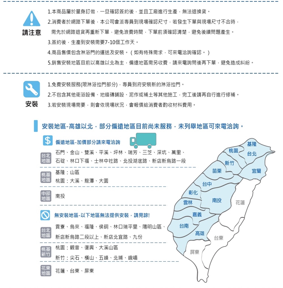 4.商品售價包含淋浴門的運送及安裝。(如有特殊需求,可來電洽詢確認。)