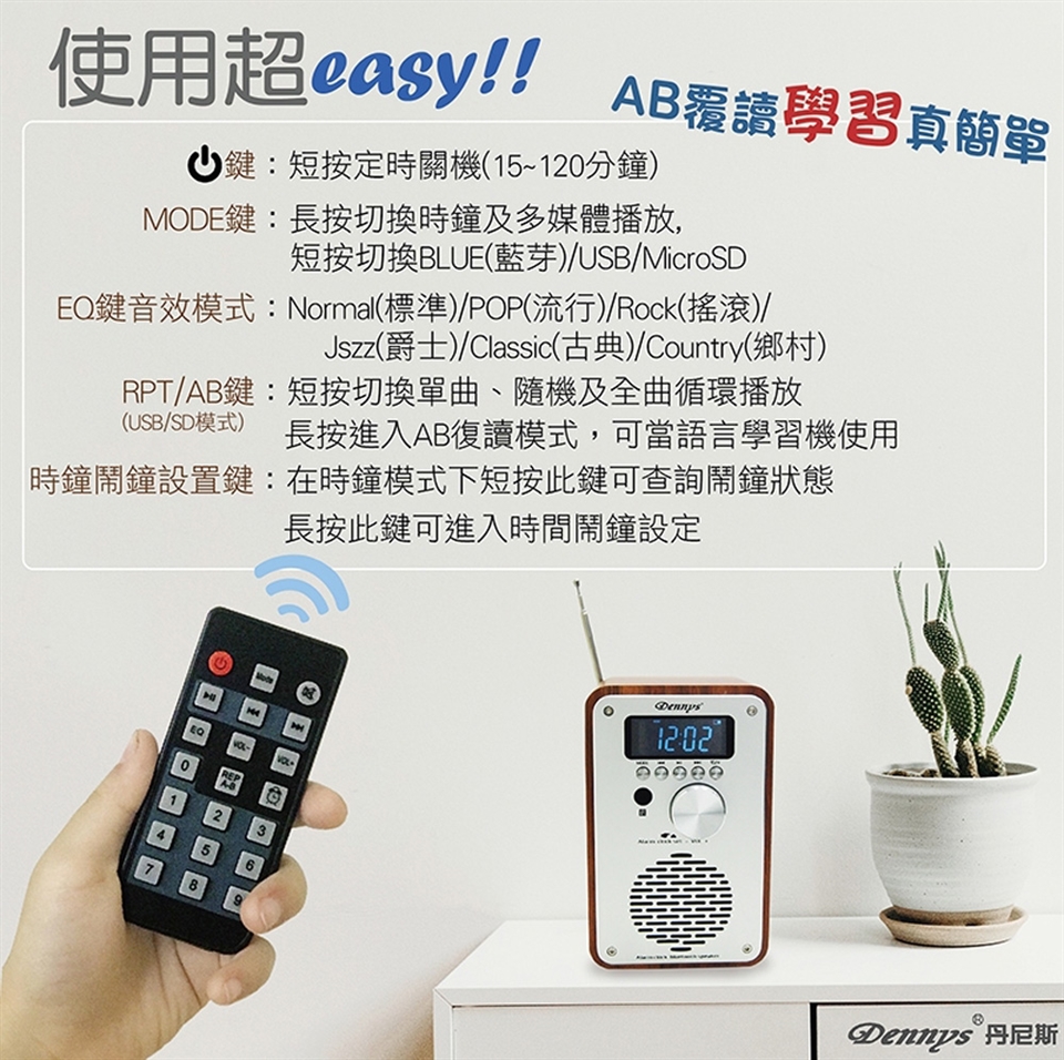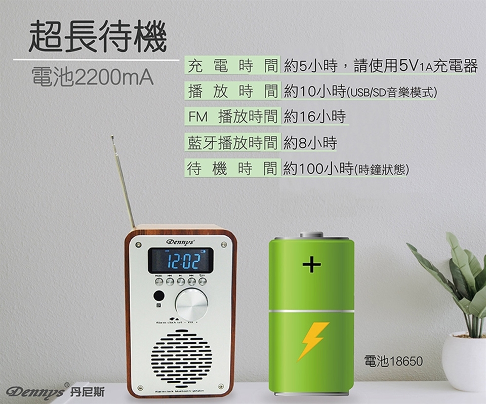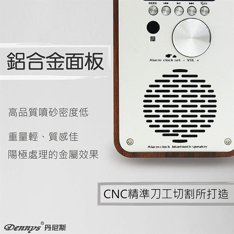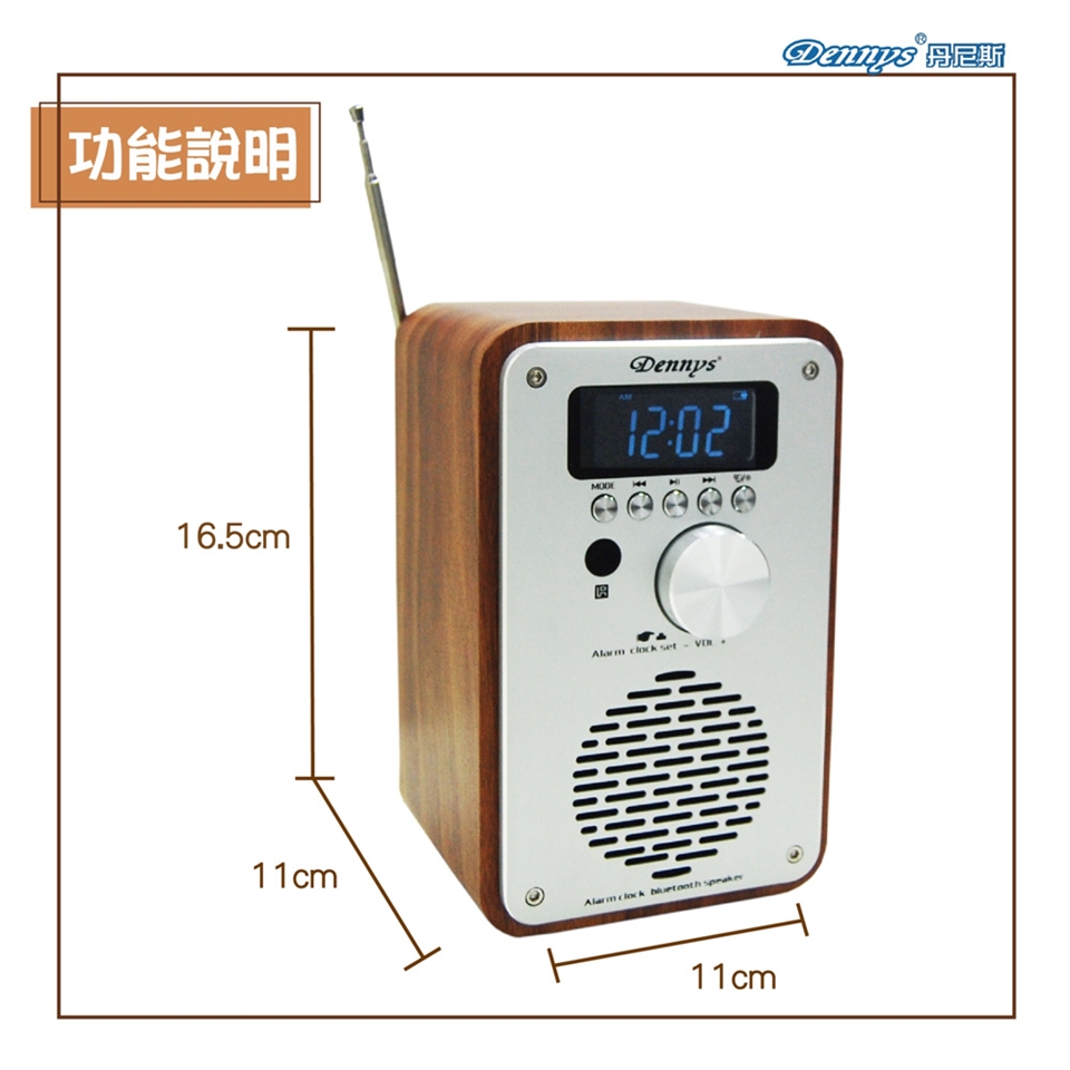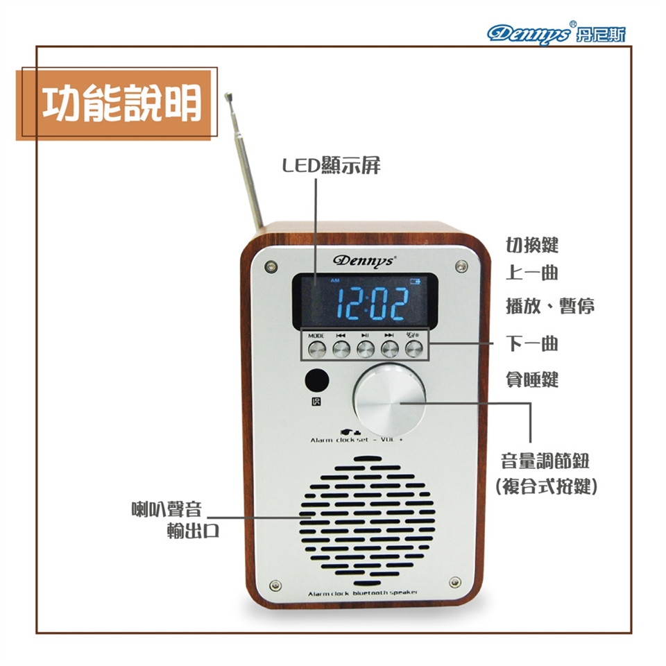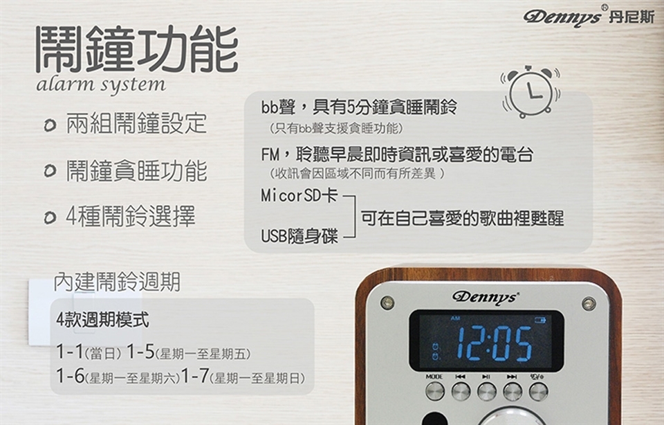 用電台音樂或鬧鈴聲喚醒您。只要在您的Dennys無線音樂鬧鐘上設定鬧鐘,即可選擇用MP3音樂或廣播電台當鬧鐘。到了設定的時間,Dennys木質無線音樂鬧鐘就會自動播放MP3音樂或廣播電台。