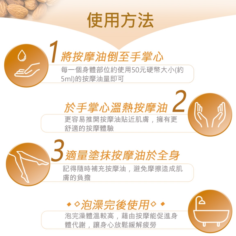 1.使用前請先進行局部肌膚測試,若有不適請立即停止使用,並諮詢皮膚科醫生。**對堅果敏感者避免使用**