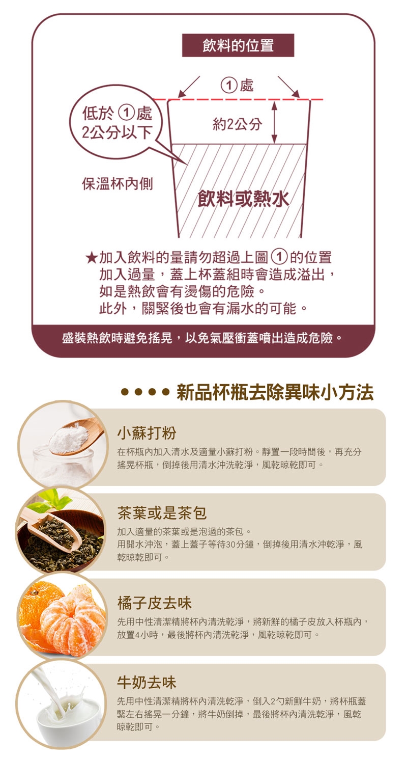 1.建議手持或放置桌面上、飲料架,請勿放入包內以免潑灑。