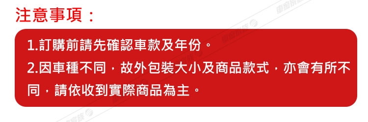 3.因車種不同,故外包裝大小及商品款式,亦會有所不同,請依收到實際商品為主。