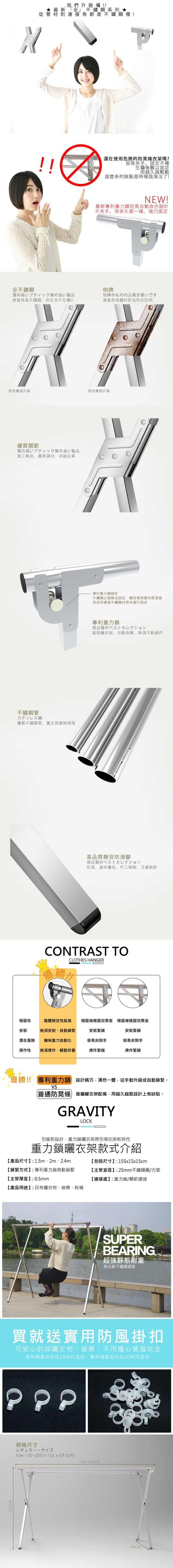 品名:全不鏽鋼2米專利重力鎖X型雙桿伸縮曬衣架