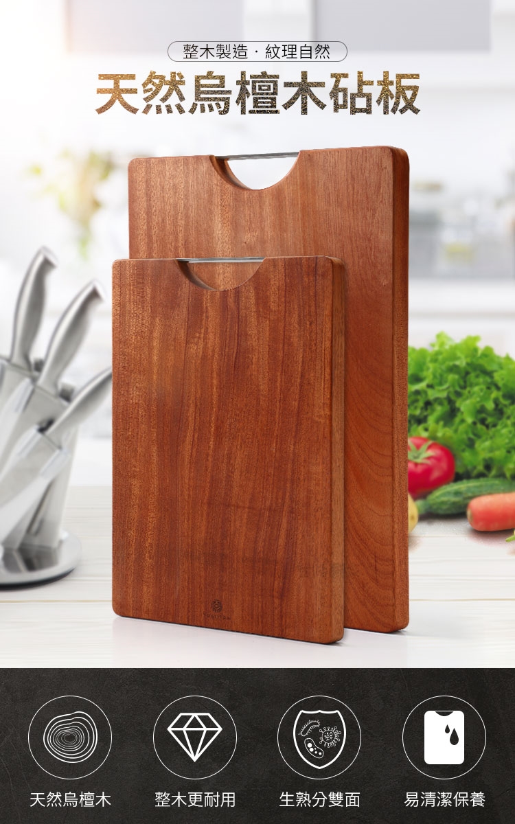 我們都知道,在廚房有一支好的刀具,少不了要有一個好的砧板,一塊好用耐用的砧板可讓你在每次料理時更加俐落乾淨,不管熟食或生食,上砧板的瞬間,手起刀落三二下便能下鍋烹煮,【生活采家烏檀木系列工具】採用上好進口烏檀木,木質密度高硬度佳、不易變形開裂清洗容易,讓你料理時完全無後顧之憂,烹煮過程完全輕輕鬆鬆!!