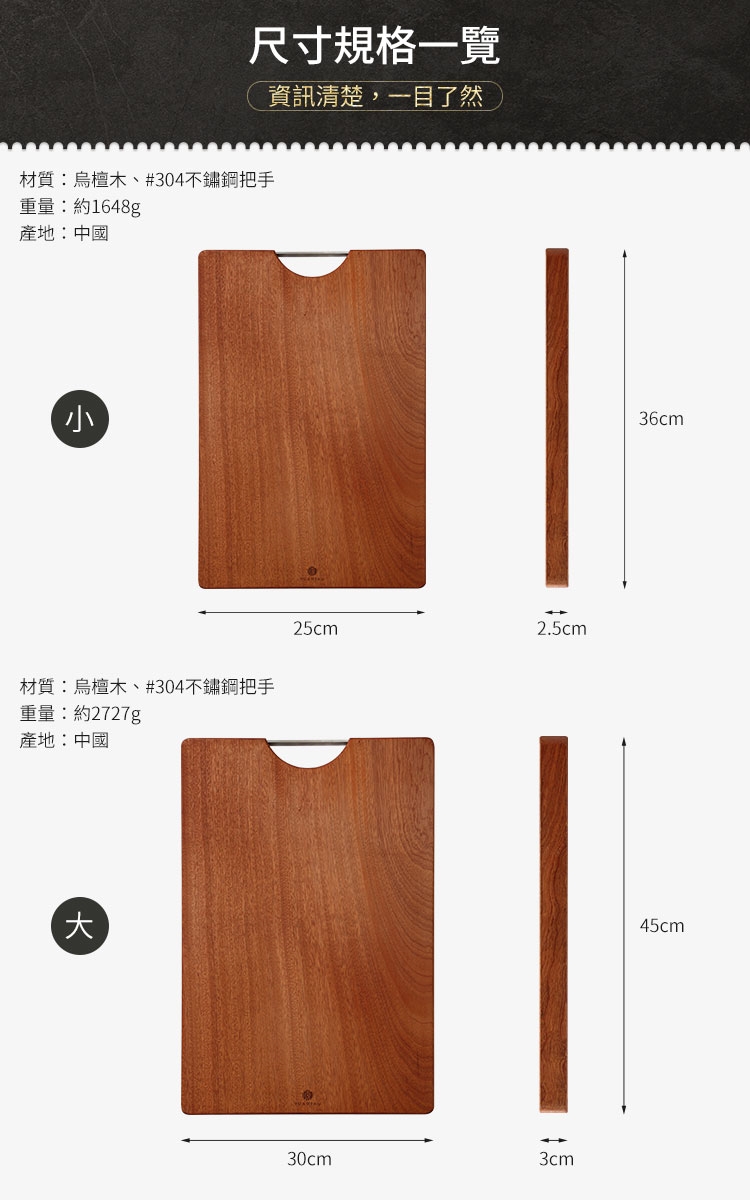 2.材質:本體-烏檀木;把手-#304不鏽鋼