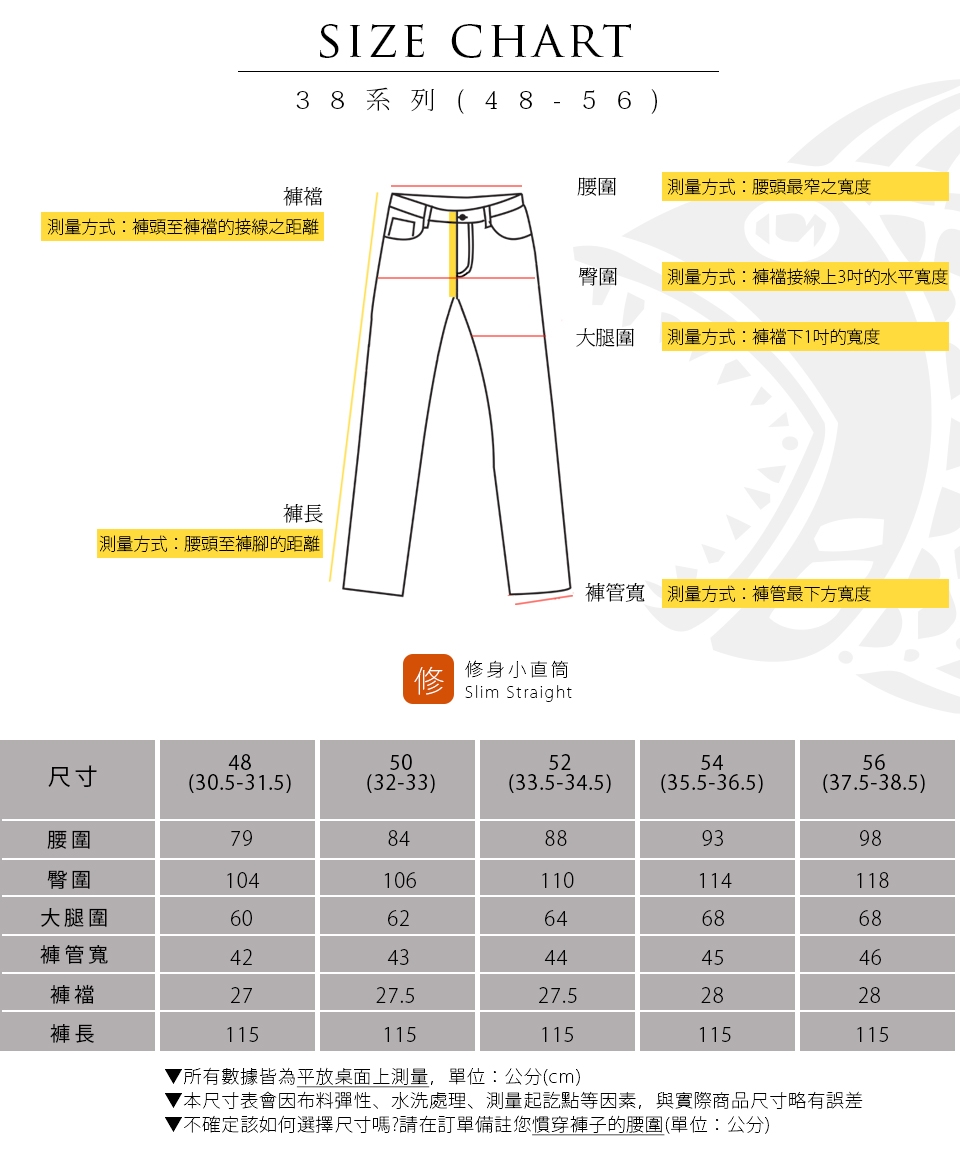 E.水洗後會有2-3%縮率,此為正 常現象,在修改褲長時請稍微增長褲長;此外,為了防止縮水,請勿使用烘乾機烘乾衣物。