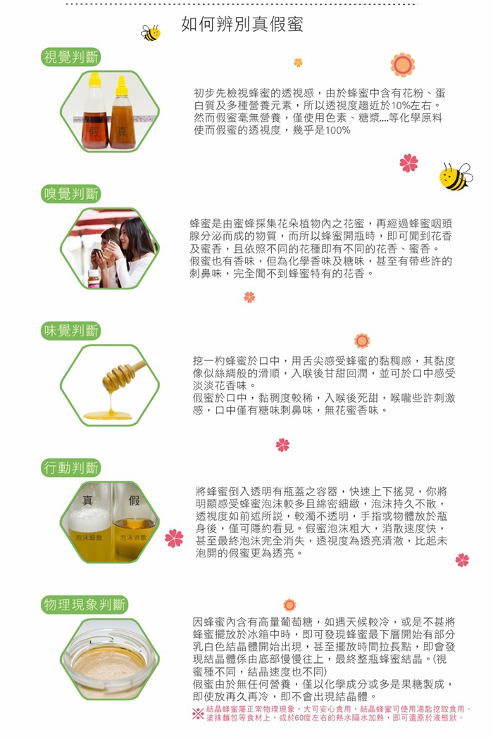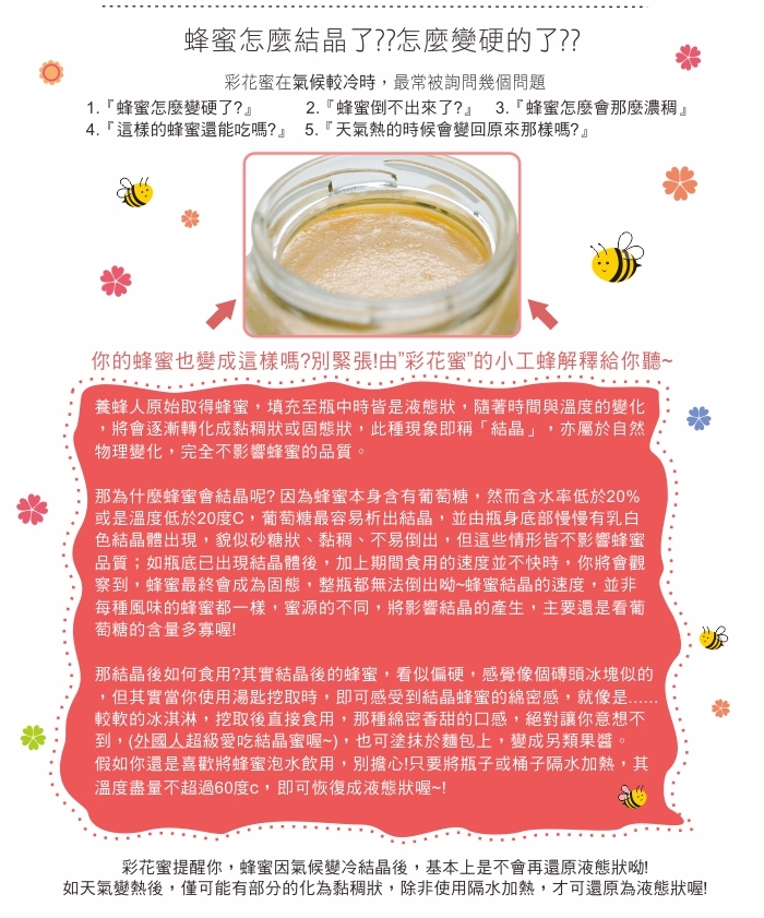 1.蜂蜜含有 葡萄糖有時會有結晶現象,請置於60℃左右溫水中,約30-60分鐘即可溶解恢復原液態狀,其品質不變請放心食用。