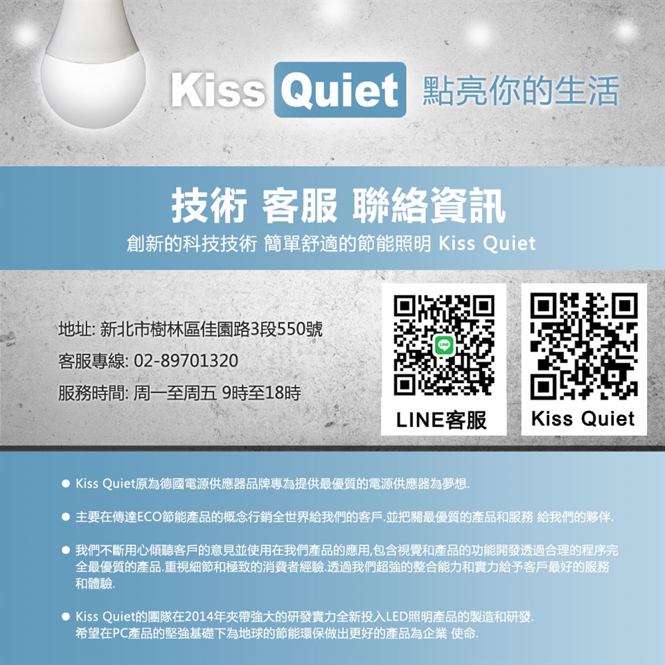 Kiss Quiet原為德國電源供應器品牌專為提供最優質的電源供應器為夢想.主要在傳達ECO節能產品的概念行銷全世界給我們的客戶.並把關最優質的產品和服務 給我們的夥伴.我們不斷用心傾聽客戶的意見並使用在我們產品的應用,包含視覺和產品的功能開發透過合理的程序完全最優質的產品.重視細節和極致的消費者經 驗.透過我們超強的整合能力和實力給予客戶最好的服務和體驗.Kiss Quiet的團隊在2014年夾帶強大的研發實力全新投入LED照明產品的製造和研發.希望在PC產品的堅強基礎下為地球的節能環保做出更好的產品為企業 使命.