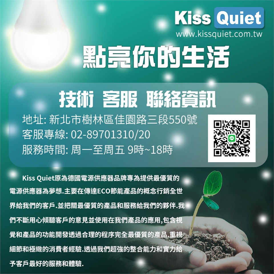 Kiss Quiet原為德國電源供應器品牌專為提供最優質的電源供應器為夢想.主要在傳達ECO節能產品的概念行銷全世界給我們的客戶.並把關最優質的產品和服務給我們的夥伴.我們不斷用心傾聽客戶的意見並使用在我們產品的應用,包含視覺和產品的功能開發透過合理的程序完全最優質的產品.重視細節和極致的消費者經驗.透過我們超強的整合能力和實力給予客戶最好的服務和體驗.Kiss Quiet的團隊在2014年夾帶強大的研發實力全新投入LED照明產品的製造和研發.希望在PC產品的堅強基礎下為地球的節能環保做出更好的產品為企業使命.