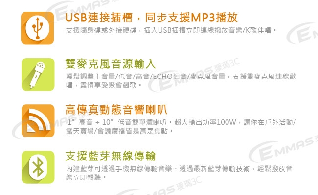 全新音場設計,效果佳,輸出音質更加清晰,絕對是K歌、舞台表演、老師、演講者及賣場銷售人員的最佳利器。最有品質保證及長期耐用的選擇。標準接線頭設計,集合多項的產品專利及技術設計,讓您的聲音傳達擁有最佳的效果表現 !