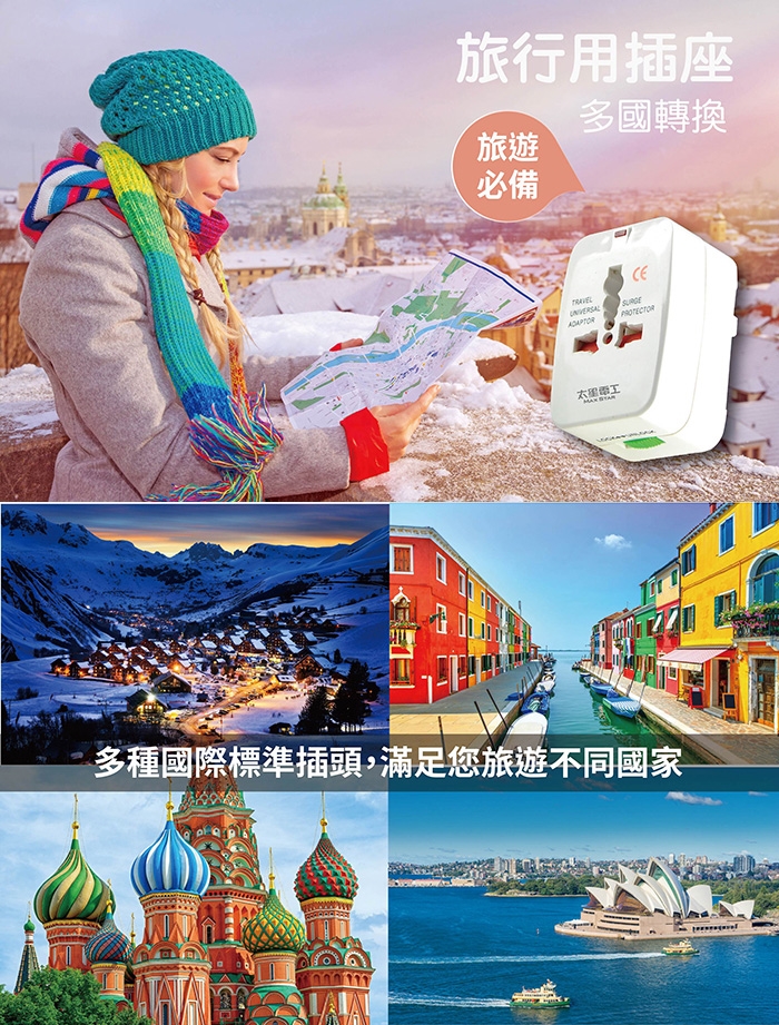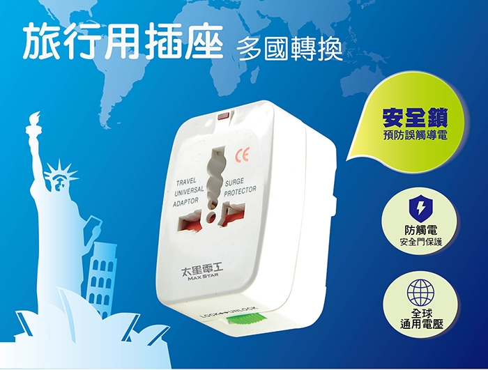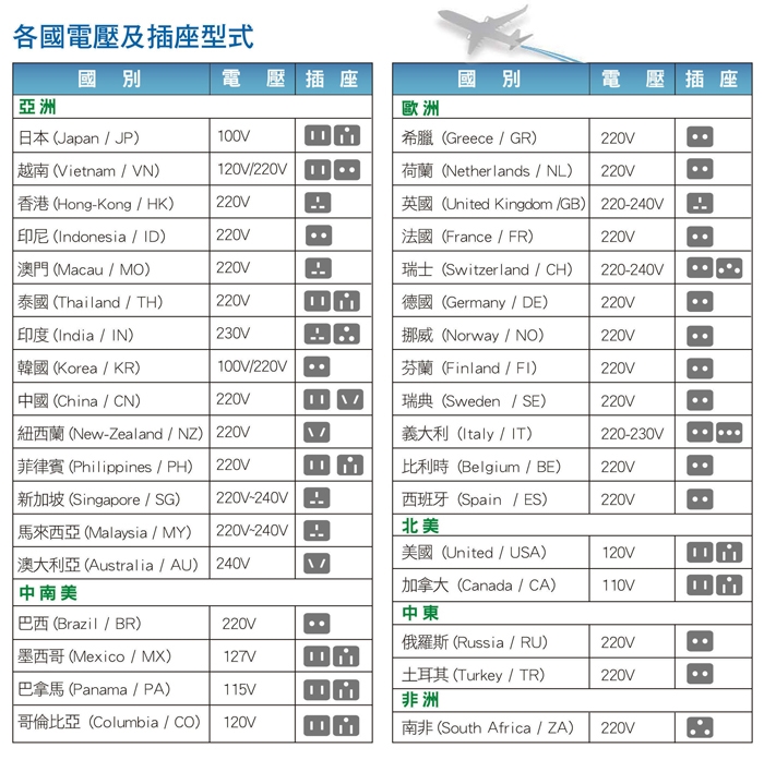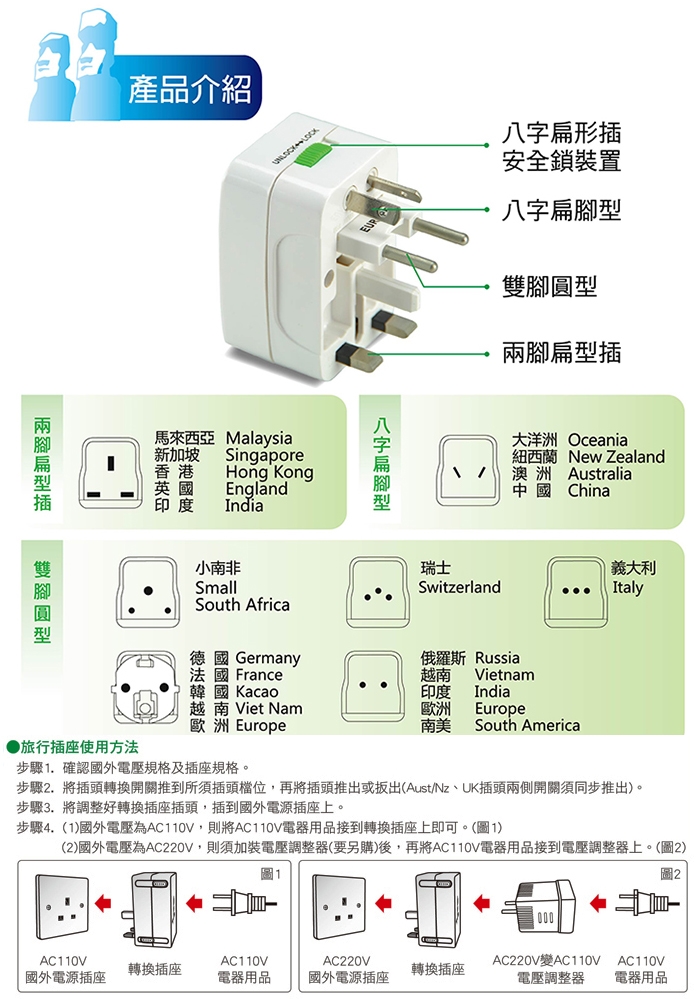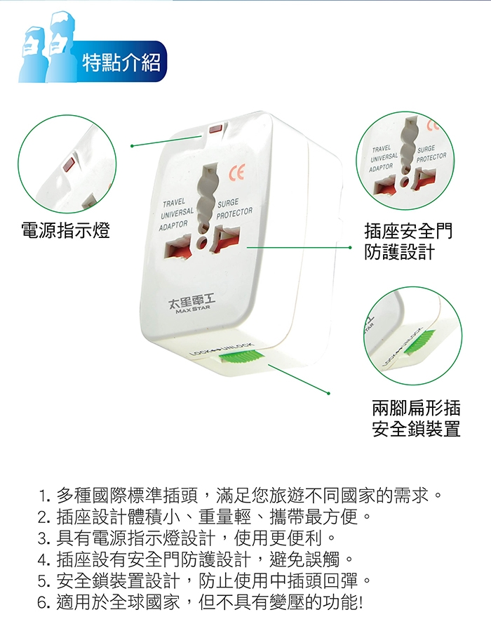 1.一機走透透,多種國際標準插頭,滿足您出國旅遊需求。