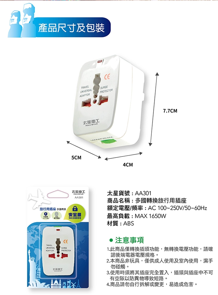 1.此商品僅轉換插頭功能,無專換電壓功能,請確認後端電器電壓規格