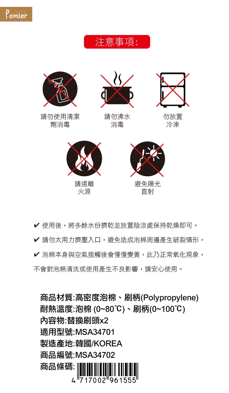 *請勿使用化學清潔劑或沸水消毒,勿放置冷藏冷凍。