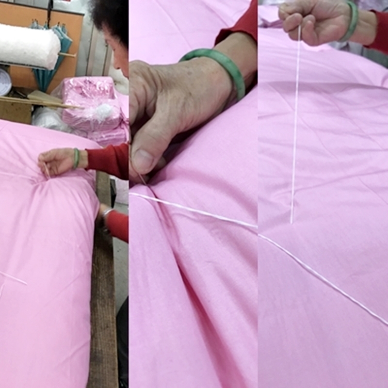 棉被最外層以純棉布包製,一針一線由老師傅親手縫成,