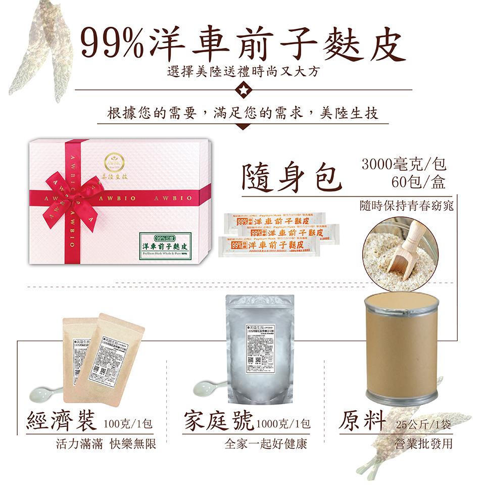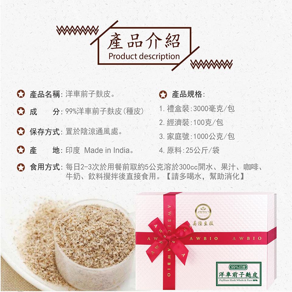 【美陸生技AWBIO】洋車前子產品介紹:名稱:洋車前子麩皮,成分:99%洋車前子麩皮(種皮),保存方式:置於陰涼處通風,產地:印度,食用方式:每日2-3次於用餐前取約5公克溶於300CC開水、果汁、咖啡、牛奶、飲料攪拌後直接後直接食用。【請多喝水,幫助消化】,產品規格:1.禮盒裝:3000毫克/包2.經濟裝:100克/包3.家庭號:1000公克/包4.原料:25公斤/袋