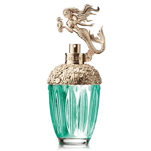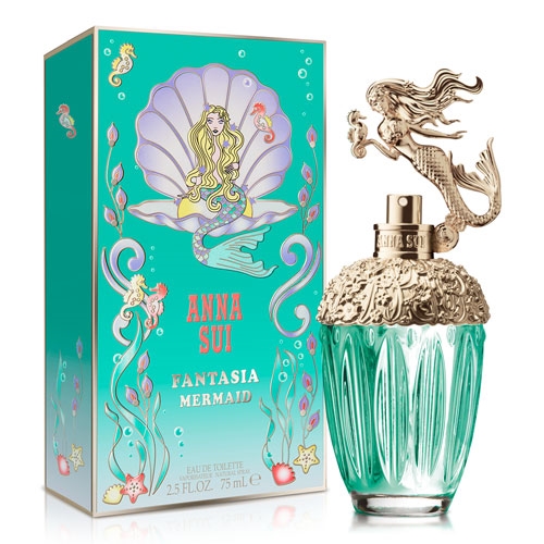 Anna Sui童話美人魚淡香水的拋光水晶瓶中承載滿滿地藍綠色汁液,折射著海洋的粼粼波光,葉子和花朵 圖樣刻烙在香檳玫瑰金瓶蓋上。聰慧的美人魚公主向海星朋友呢喃細語地訴說其中秘密。而呈現海洋風情的青碧 綠外盒上,海星和海馬環繞著童話美人魚,精緻金屬銀邊折射倒映出海底宮殿的千變萬化,美人魚公主棲息在薰衣草色貝殼上,優雅帶點俏皮趣味。