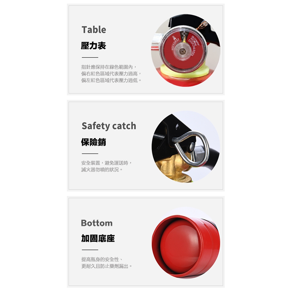 拔出保險銷,將噴嘴對準火源,壓下把手即可滅火。
